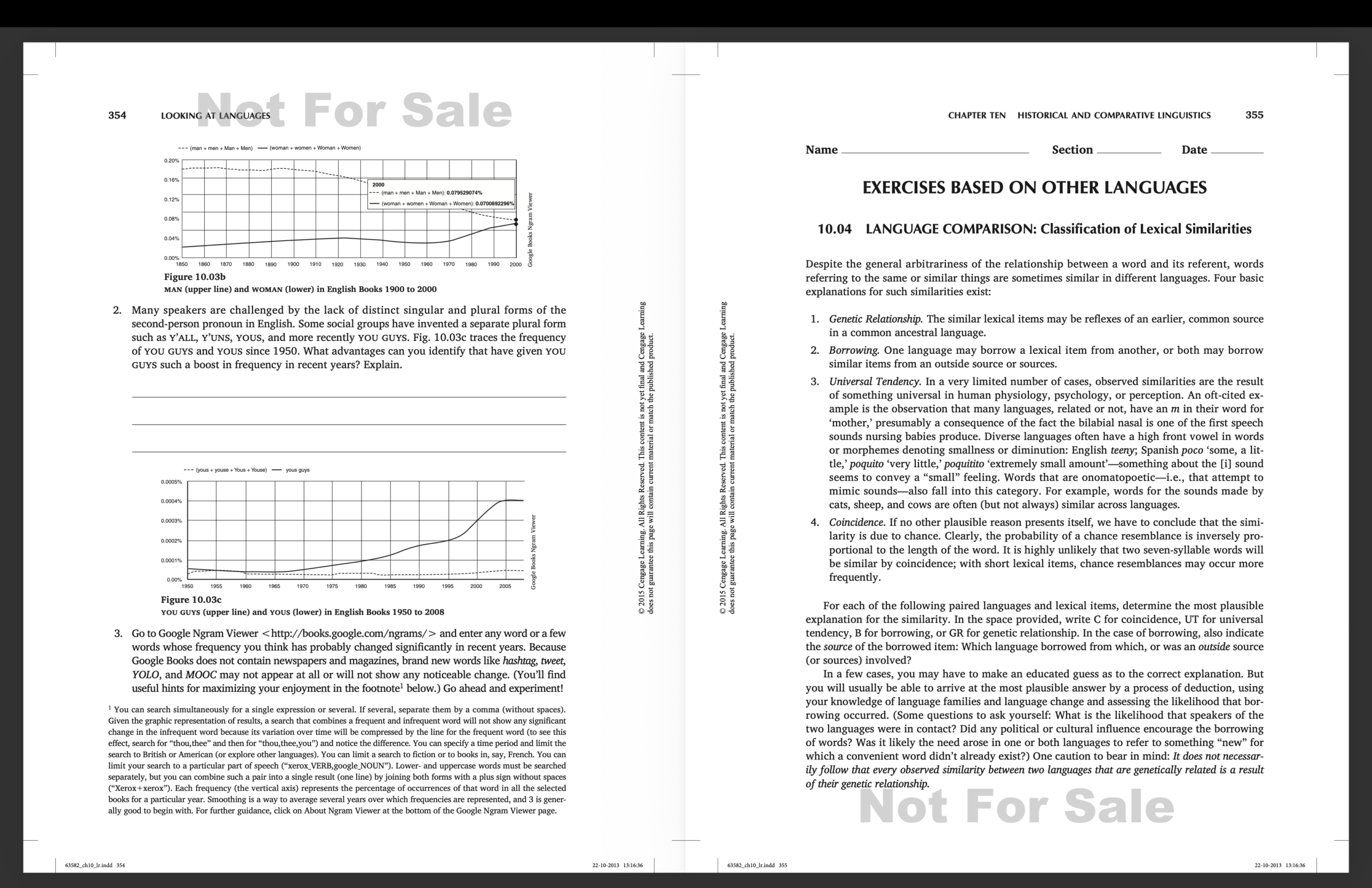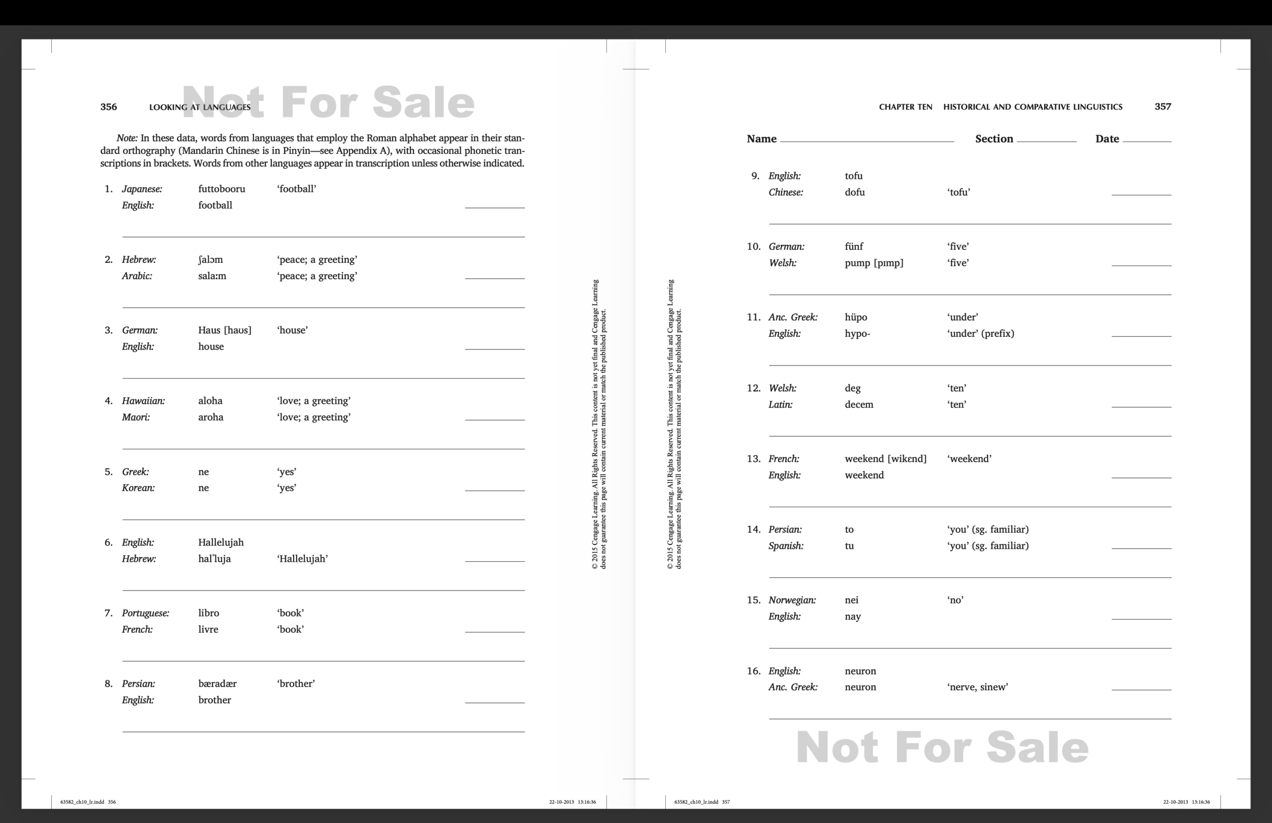 I thought I’d share this exercise with you from the linguistics workbook I wrote years ago with Edward Finegan, Looking at Languages. The idea is for students to look at similarities in different languages and decide how to explain them. Are the languages related, so that you would expect to see lots of similar things? Did one language borrow from the other? Could there be some universal tendency involved? Or is the similarity merely a coincidence? If you’re interested and you have some time, take a look! Make sure to read the introduction first. I’ve included the answer key, but don’t be tempted to check it until you’ve completed the whole exercise. Have fun!