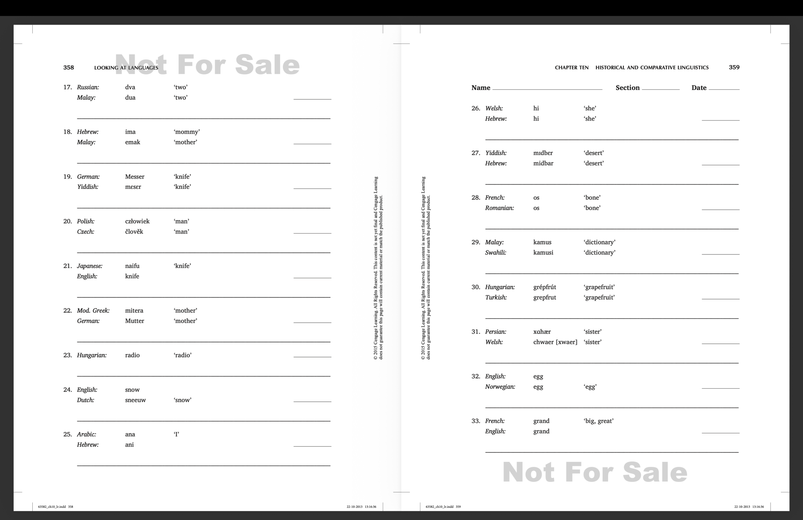 1. B Japanese borrowed from English. 2. GR 3. GR 4. GR 5. C 6. B English borrowed from Hebrew. 7. GR 8. GR 9. B English borrowed from Chinese. 10. GR 11. B English borrowed from Greek. 12. GR 13. B French borrowed from English. 14. GR 15. B English borrowed from the ancestor of Norwegian. 16. B English borrowed from Greek. 17. C 18. UT 19. GR 20. GR 21. B Japanese borrowed from English. 22. GR 23. B Both borrowed from a third source. 24. GR 25. GR 26. C 27. B Yiddish borrowed from Hebrew. 28. GR 29. B Both borrowed from a third source (Arabic). 30. B Both borrowed from English. 31. GR 32. B English borrowed from the ancestor of Norwegian. 33. B English borrowed from French. 34. GR 35. GR 36. C 37. B English borrowed from Tongan. 38. B Japanese borrowed from Chinese. 39. B Korean borrowed from Chinese. 40. B English borrowed from Malay 41. C 42. B/GR Malay borrowed from Arabic, Yiddish borrowed from Hebrew. Hebrew and Arabic are genetically related.